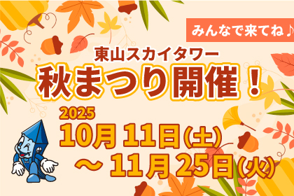 スケジュール SCHEDULE イベントスケジュール 2025.10.03 【10月25日、26日】各日先着100名/東山スカイタワーオリジナルノートプレゼント! 2025.10.03 【10月19日】#SNSキャンペーン開催! 2025.10.03 【10月18日】ハロウィンハット 作ってかぶろう! 2025.10.03 【10月11日、12日】簡単♪カボチャの形のカバン作り♪ 2025.10.03 【参加無料】スマホで五・七・五!俳句コンテスト! 2025.10.03 配布期間:10月11日~11月25日【先着3000名様】 2025.10.03 東山スカイタワー秋まつり2025開催! 2025.07.30 東山スカイタワー春まつり 俳句コンテスト入賞作品発表!! 2025.03.27 ☆彡のっぴーグリーティング☆彡